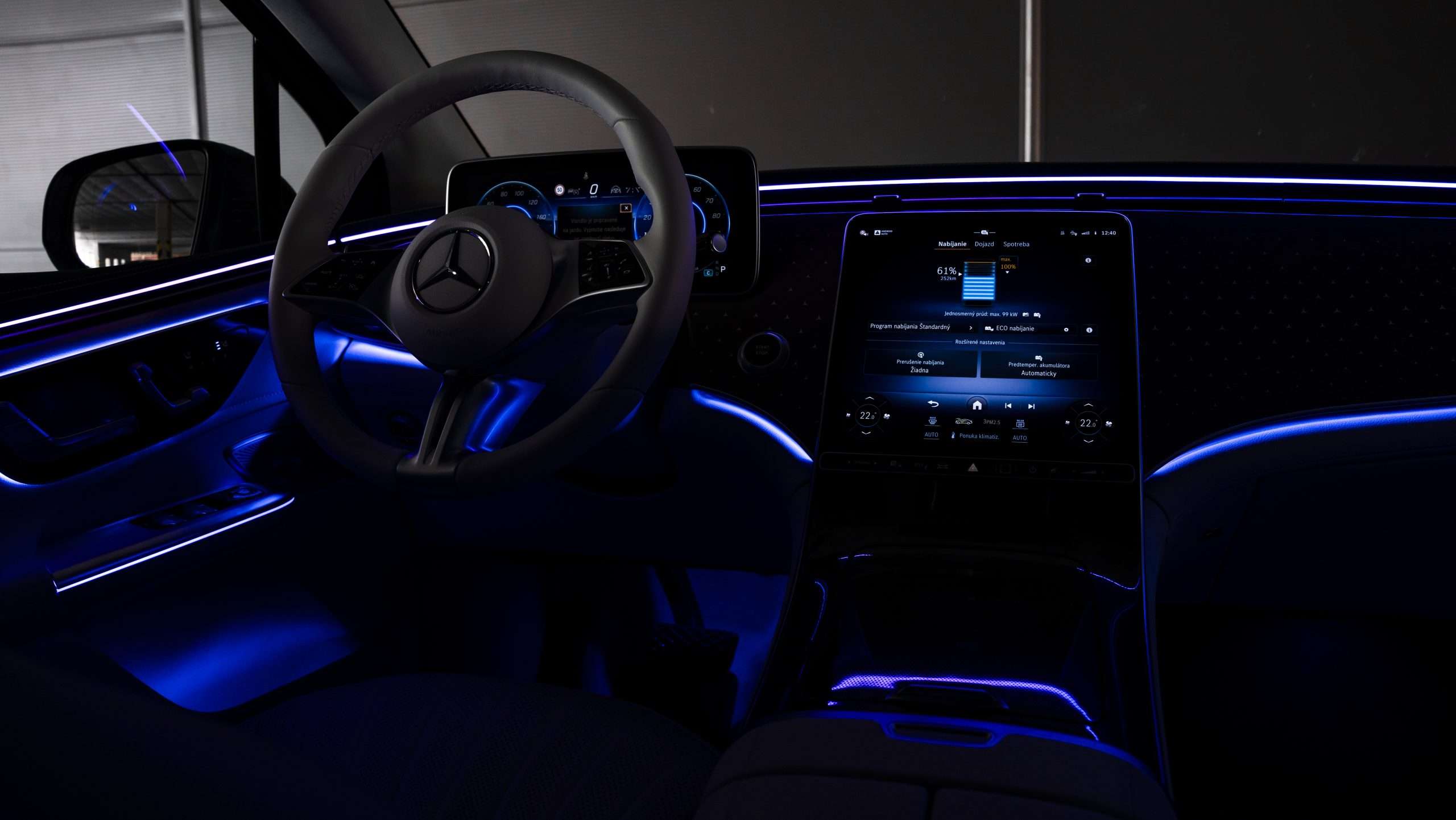 Čo sa týka nabíjania, to je rýchle, a zo zastaralejšieho 400-voltového systému žmýka naozaj maximum – energia môže do batérie tiecť jednosmerným prúdom s maximálnym výkonom až 170 KW. Len na porovnanie, taký Voyah Free sa nabíja s výkonom maximálne 120 kW, je však výrazne lacnejší. Palubná nabíjačka má v štandarde výkon 11 kW, takže napríklad doma batériu nabijete za 9 hodín. V rámci príplatkovej výbavy je možné EQE SUV vybaviť palubnou nabíjačku s výkonom 22 kW, ktorá tento čas skráti na polovicu. Nabíjací port sa nachádza vzadu vpravo.