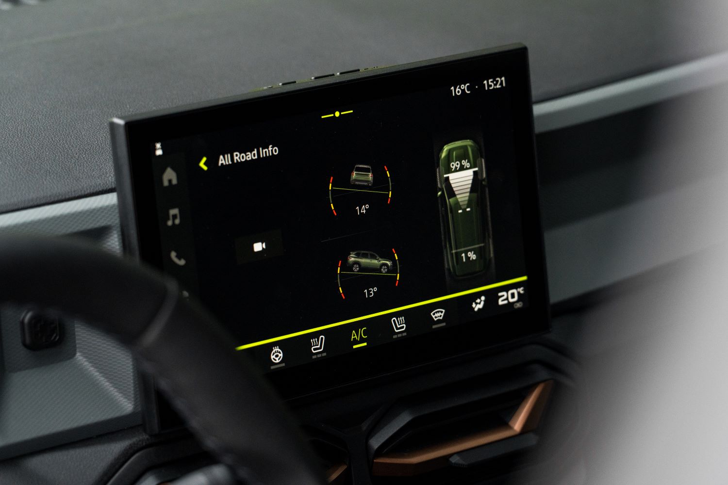 Na nespevnenom podloží sme otestovali aj trakciu, ktorá na celoročných pneumatikách bola úplne bezproblémová. Pohon aktívne rozdeľuje hnaciu silu medzi predné a zadné kolesá, vždy v pomere, aký aktuálne vyhodnotí za správny. Ako vodič to okrem citu viete aj aktívne sledovať cez infotainment. Terénne zobrazenie prináša informácie o práci štvorkolky, uhly stúpania a náklonov, ale hlavne rýchly prístup ku kamerovému systému. Bigster dostal 360-stupňový kamerový obraz, ktorý síce nemá najvyššiu kvalitu v triede, ale je veľkým pomocníkom pri stúpaniach alebo zjazdoch.