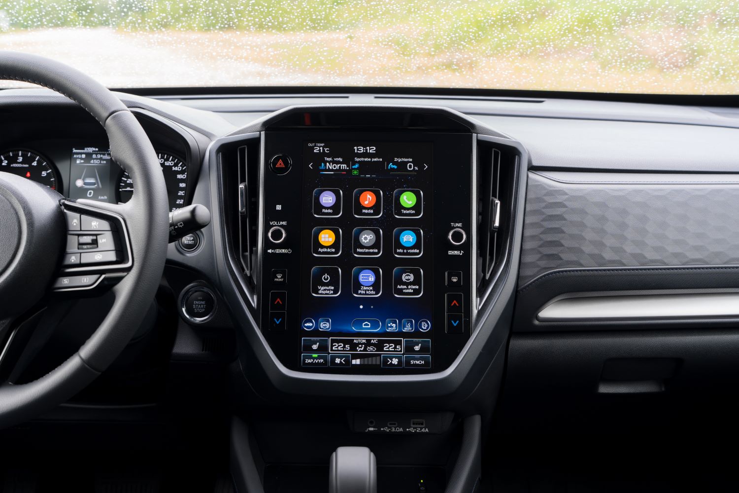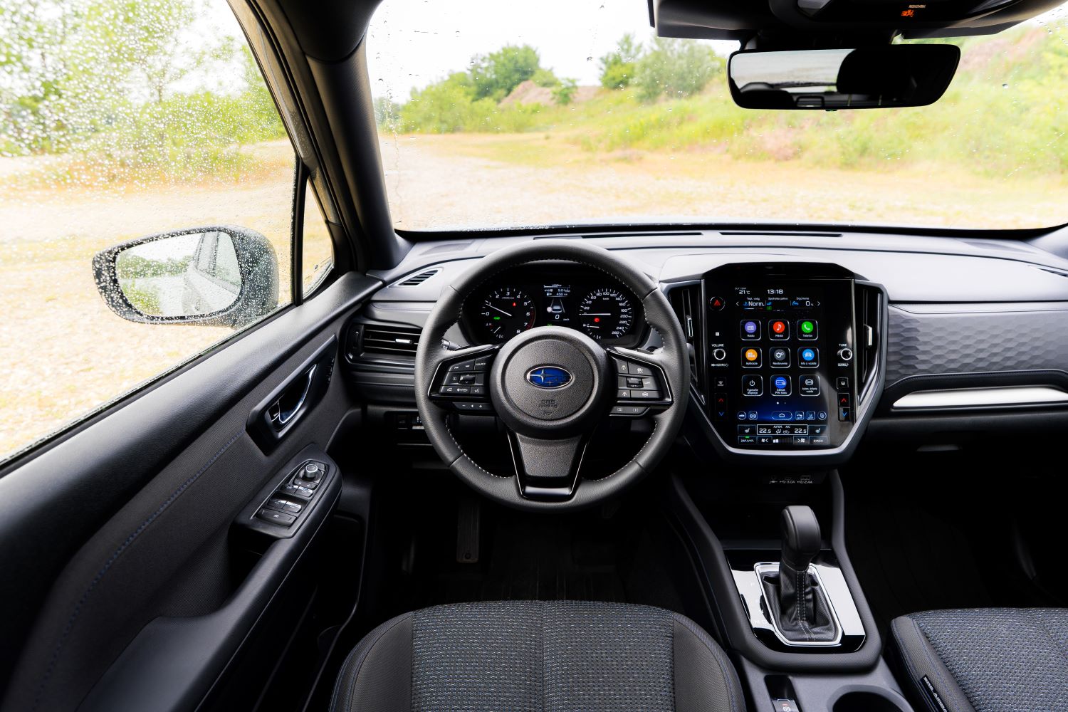 Pri pohľade dovnútra sa opäť musíme vrátiť k úvodu. Subaru to nerobí pre pekné produktové fotky a páčiky na sociálnych sieťach, ale pre ľudí. Preto je interiér na pohľad fádny, ale taktiež jednoduchý na používanie. Dominantným prvkom je 11,6″ dotykový stredový displej, ktorý má však mimoriadne prehľadné používateľské rozhranie. Je síce pomalší, ale ponúka bezdrôtovú konektivitu. V jeho tesnej blízkosti sa nachádzajú hardwarové ovládače teploty a taktiež hlasitosti. Tým pádom pekne vyvažuje ergonómiu ovládania, aj keď väčšinu funkcií klimatizácie musíte ovládať cez displej. Ale zvyšok interiéru je v dnešnom ponímaní také malé retro. Analógové budíky, LED výstrahy namiesto head-up displeju. Kvalitou spracovania sa však drží vysoko a aj keď použité materiály nie sú exotické, sú príjemné na dotyk.
