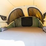 Vnútorný priestor stanu je fantastický. Nám príroda nadelila možnosť spoľahlivo overiť výšku do 180 centimetrov, ale dovolíme si povedať, že priestor na extra 20 centimetrov tu je. Veľkou výhodou je vstavaný matrac, takže neležíte na holej zemi. Premyslený zipsový systém umožňuje dovnútra pustiť nielen svetlo, ale taktiež vzduch cez okná so sieťkami proti hmyzu. Pre maximálne prúdenie vzduchu počas horúcich dní je možnosť otvoriť obe strany stanu. Škoda ponúka aj kopec značkového kempingového príslušenstva, nám sa najviac zišla lampička so solárnym nabíjaním.