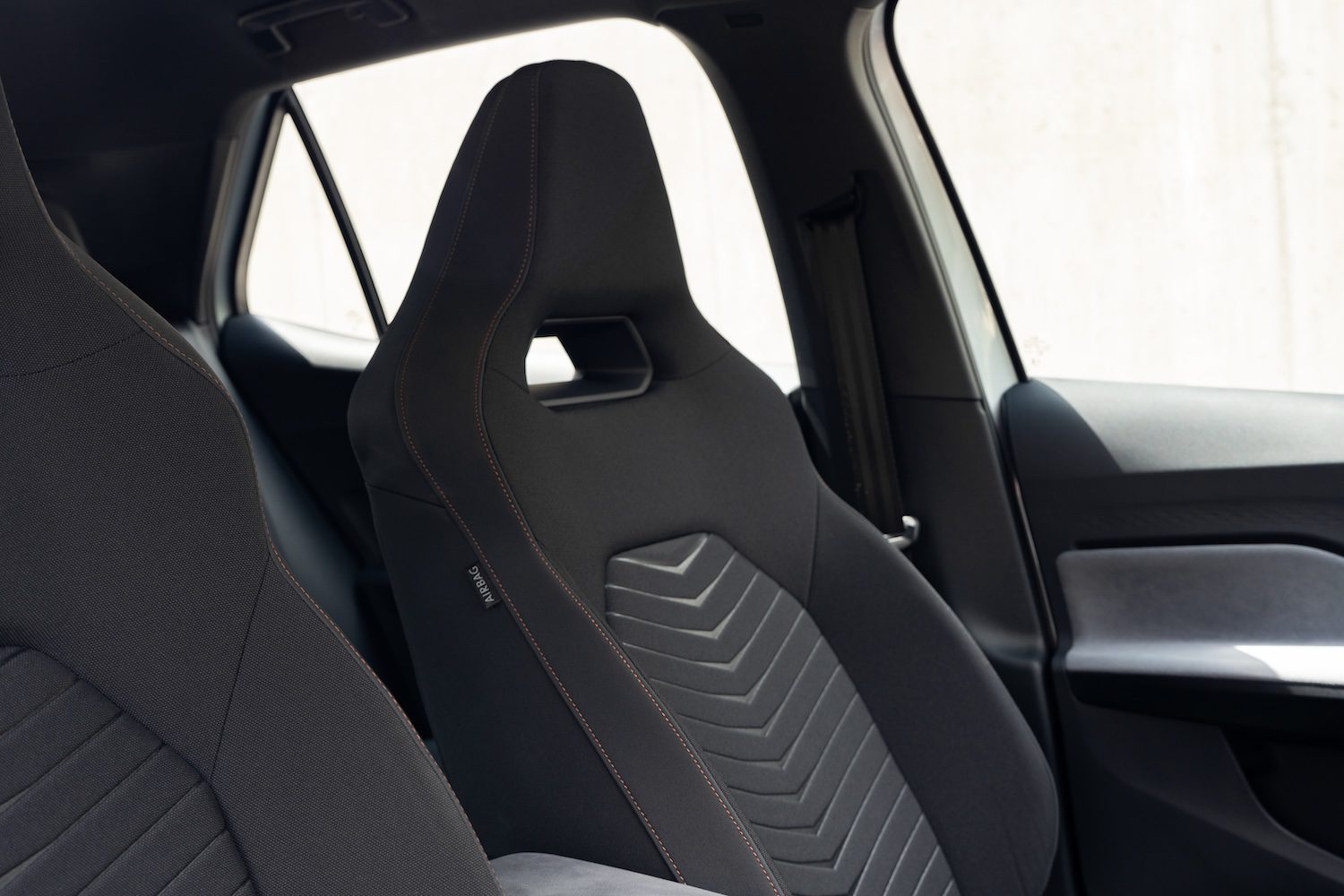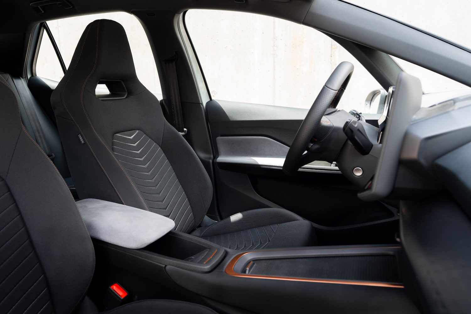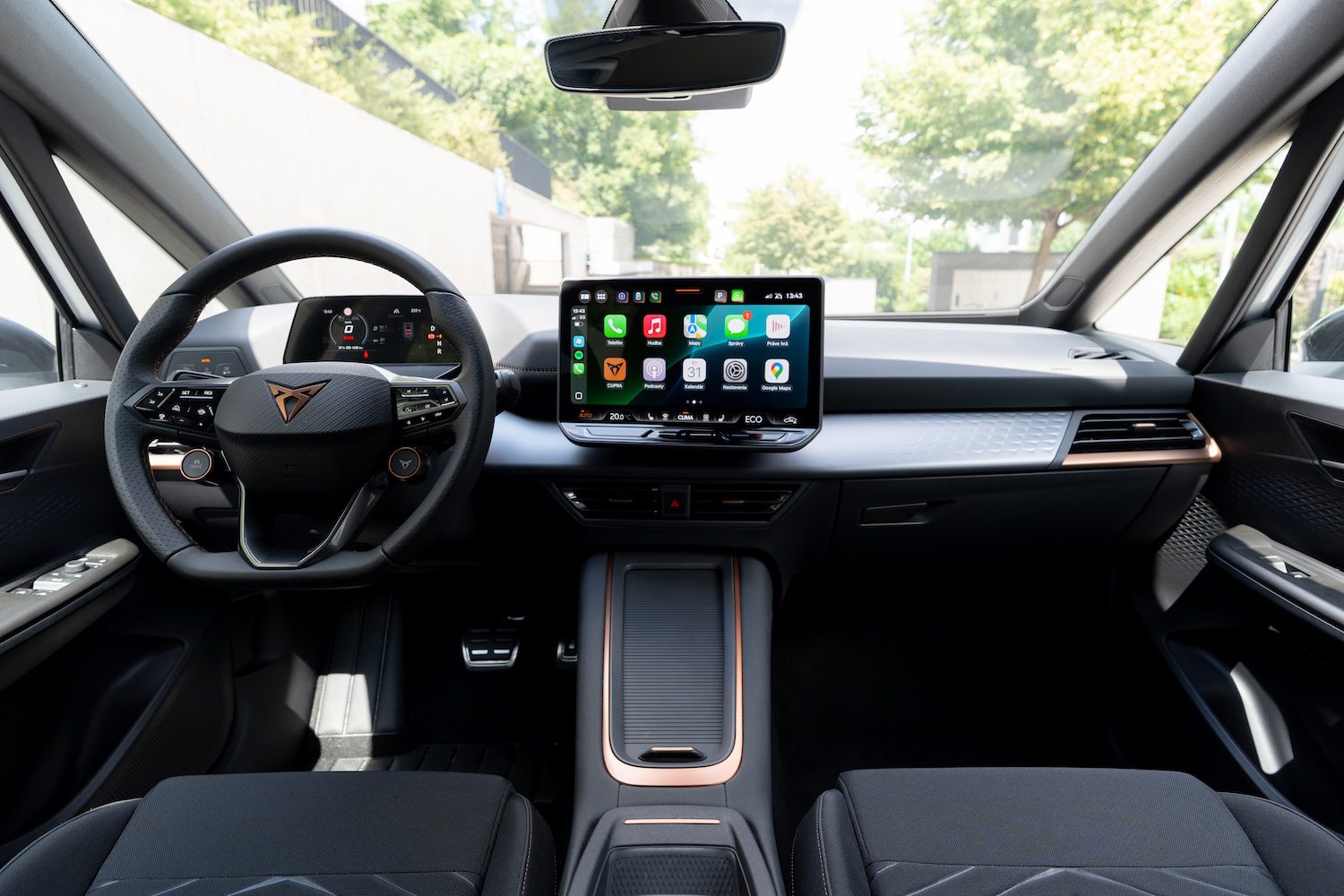 Platforma MEB maximalizuje priestor a umožňuje dômyselné využitie úložného priestoru, ako je napríklad vysoká stredová konzola. Tento priestor je vyhotovený rovnakým neoprénovým materiálom ako škrupinové sedadlá, čo dodáva dizajnu väčšiu súdržnosť a zvyšuje pocit z kvality kľúčových dotykových bodov. V praxi to vyzerá tak, že Born vyzerá pri pohľade na karosériu pomerne kompaktne, ale vnútorný priestor je prekvapivo priestranný. Batožinový priestor má objem 385 litrov. Plávajúca 12-palcová dotyková obrazovka infotainmentu, ktorá je súčasťou štandardnej výbavy všetkých modelov, je naklonená smerom k vodičovi, čo umožňuje jednoduchý prístup k množstvu funkcií.