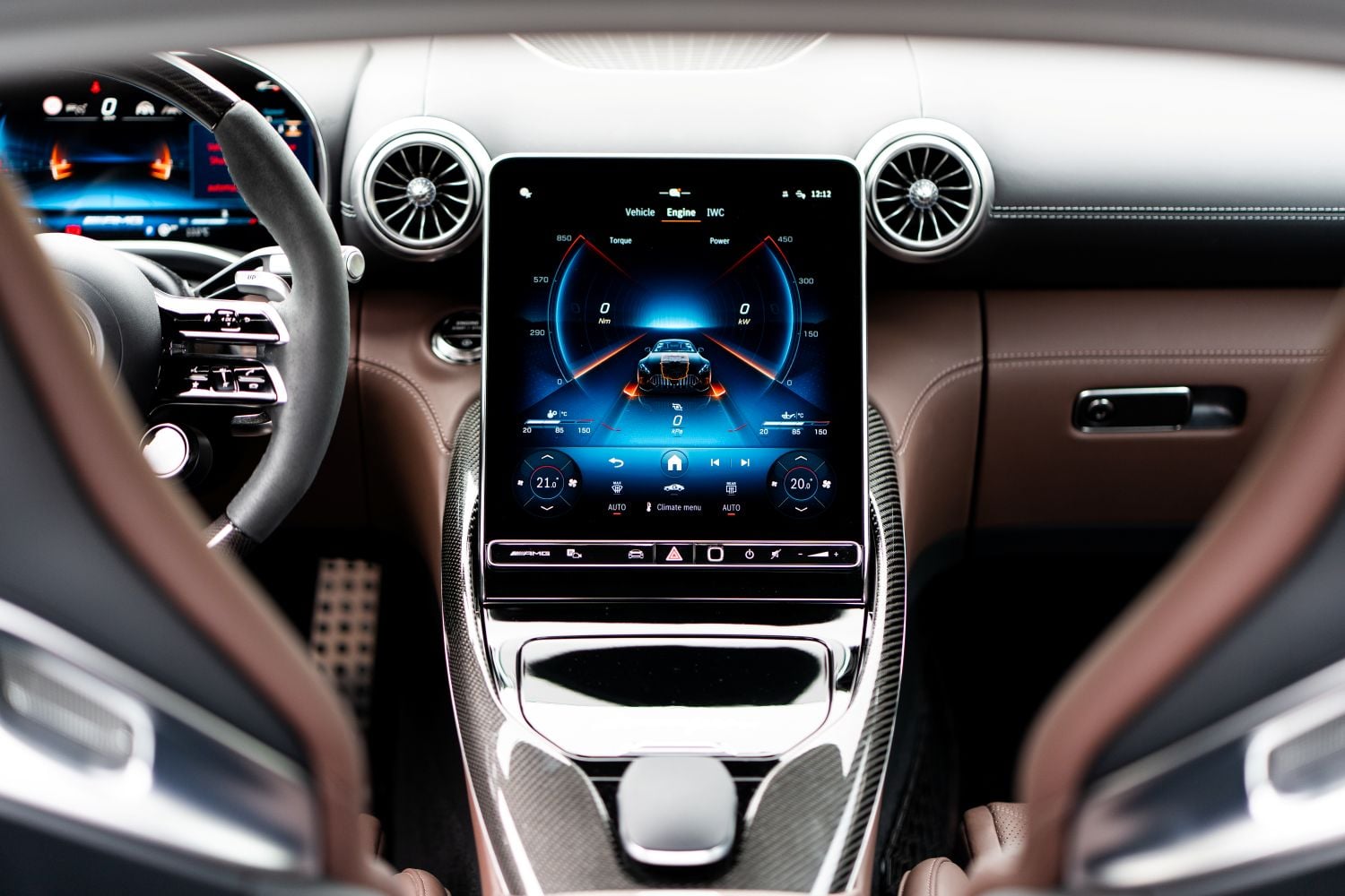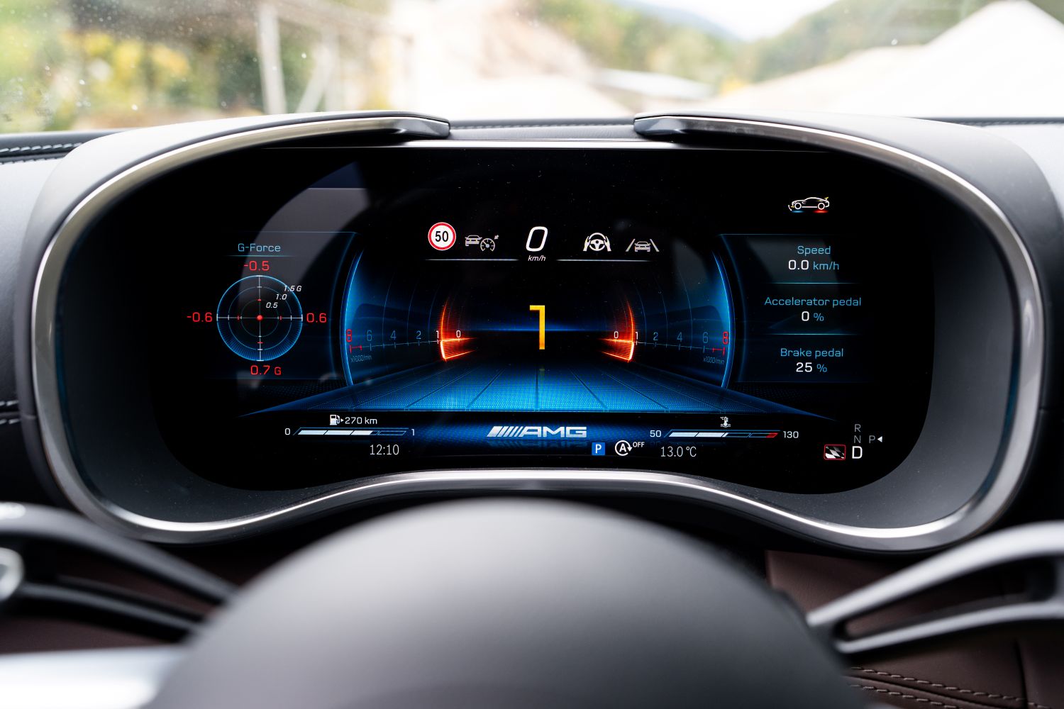 Prostredníctvom otočného ovládača na volante je možné si zvoliť jeden zo štyroch jazdných režimov – Comfort, Sport, Sport+ a Race. 9-stupňová automatická prevodovka má, pochopiteľne, možnosť manuálneho radenia pádlami pod volantom, ale pre maximalizáciu rýchlosti je možné ju pokojne nechať v automatickom režime. Motor beží do otáčok ako zbesilý a odhadnúť ideálne spektrum na preradenie na ďalší prevodový stupeň v čase, keď prudká akcelerácia a preťaženie 1,0 g zužujú vnímanie okolitého sveta do rozmazanej šmuhy, si vyžaduje tréning, na ktorý sme nemali dostatočný čas ani bezpečné prostredie. Svoje jazdné zručnosti si však vy viete zlepšiť v jazdeckej škole AMG EXPERIENCE, kde z každého auta dokážete vyžmýkať maximum. Napriek tomu sme si jazdu dokonalo užili aj v automatickom móde a nemali sme pocit, že by sme boli zo schopností auta o niečo ukrátení.