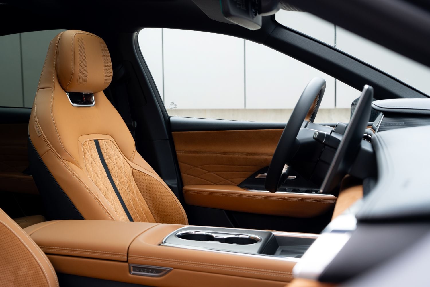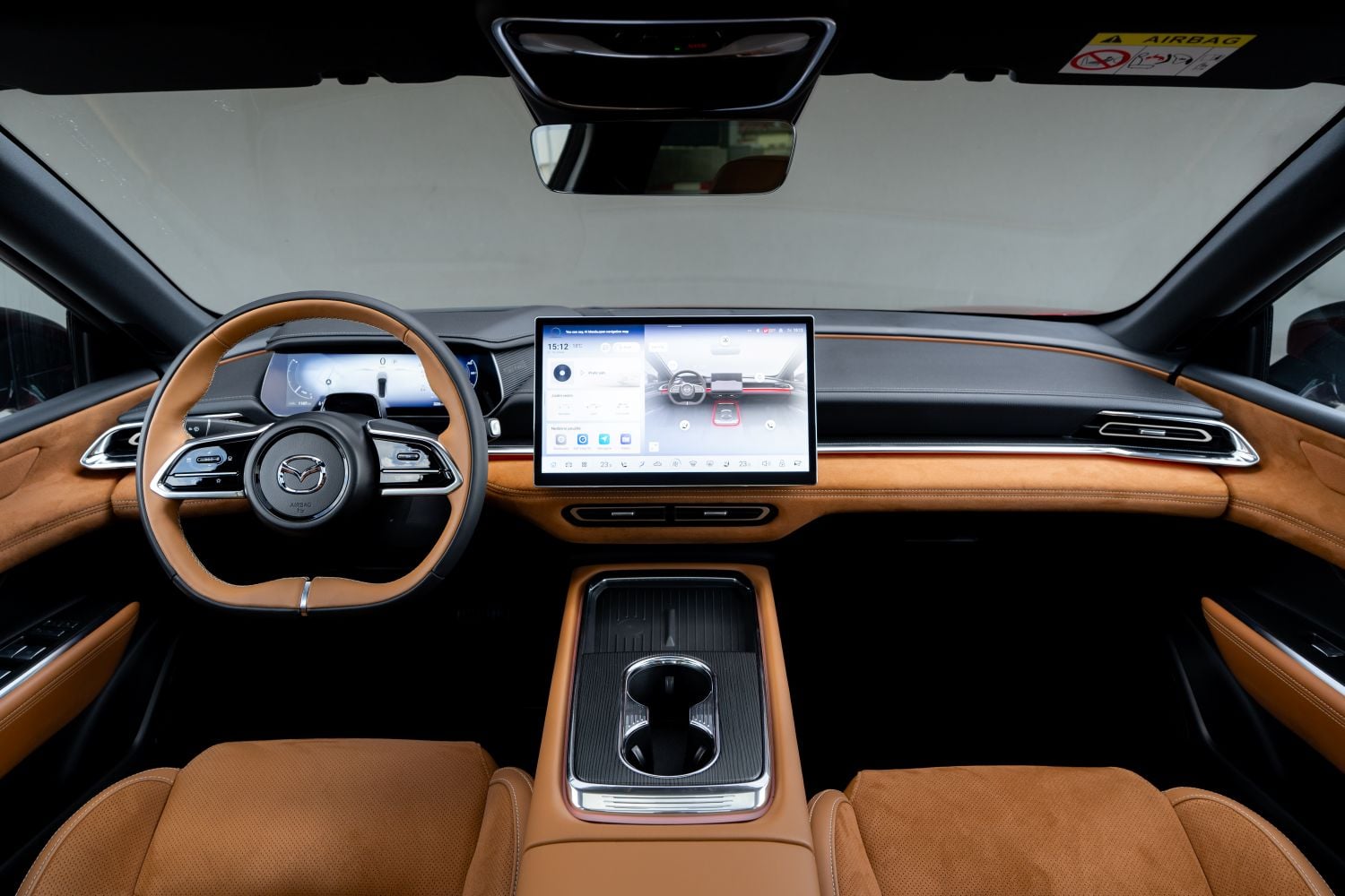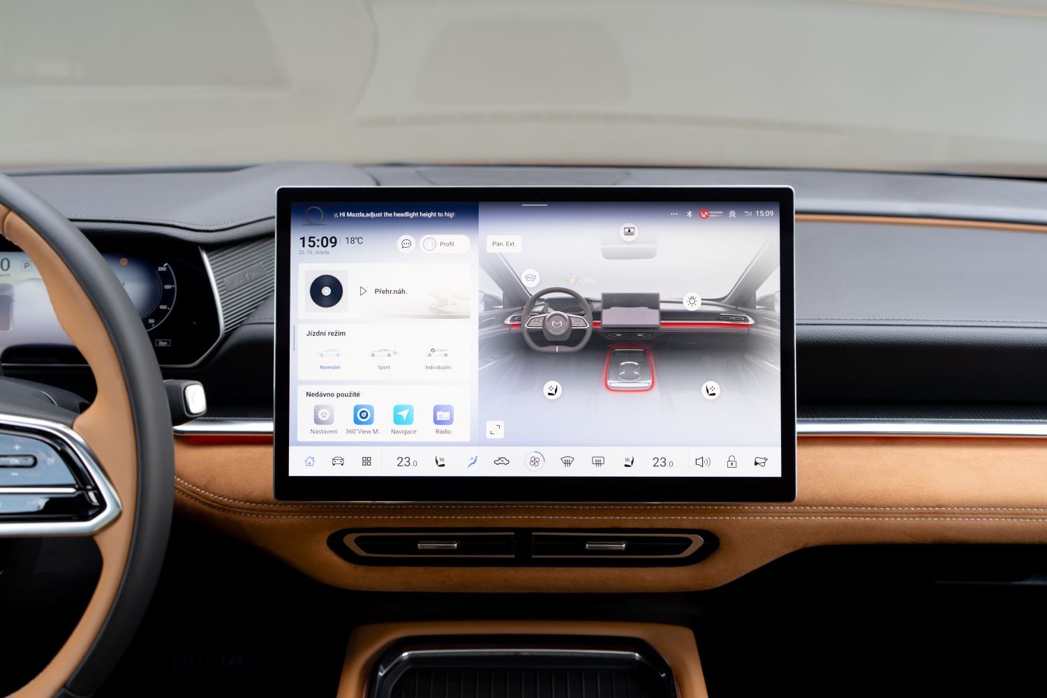Po nasadnutí do auta vás uchváti impozantný interiér. Mazda vsadila vyslovene na luxusný dojem a kvalitné materiály. Brúsená useň pokrýva drvivú väčšinu interiéru a odvážna hnedá farba lahodí oku v kontraste s čiernou. Oceňujeme aj množstvo prepracovaných detailov ako napríklad tlačidlá s logom Mazda, skryté reproduktory či samotný kľúč s kryštalickým vzhľadom.