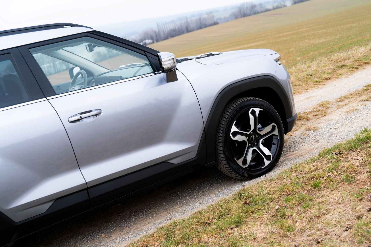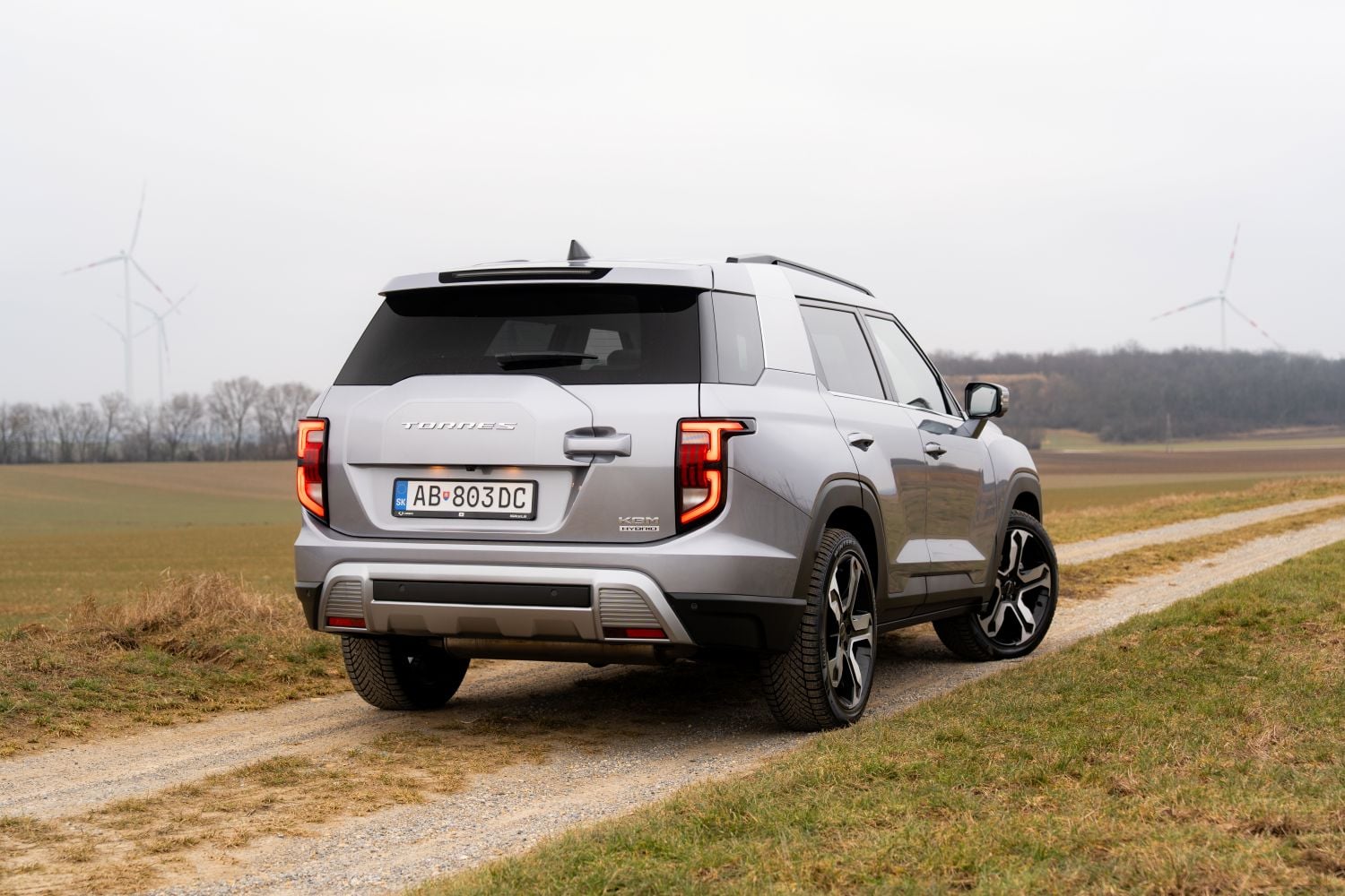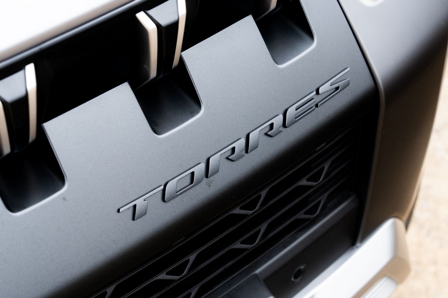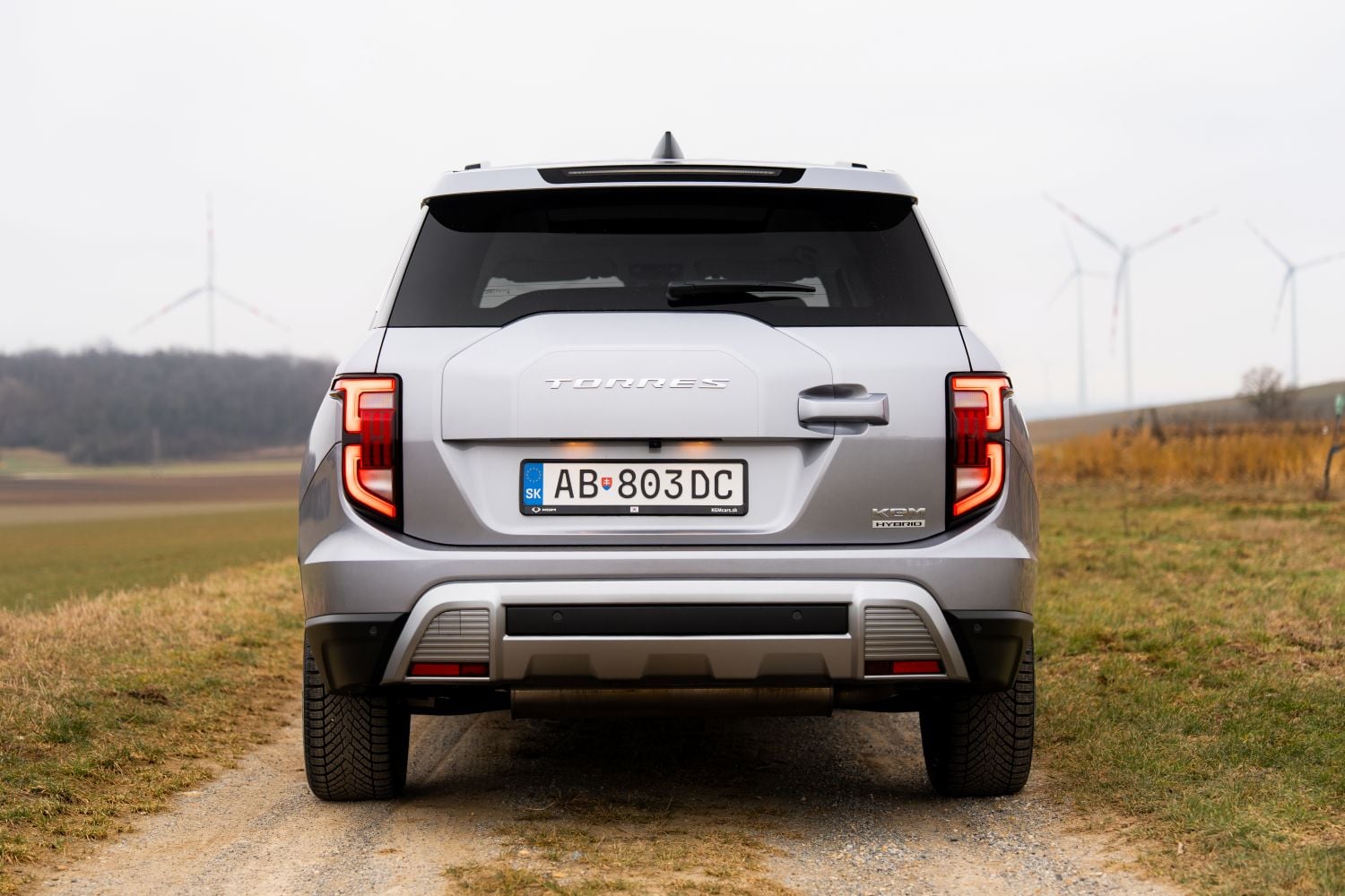 Vonkajšie rozmery vozidla sú 4705 x 1890 x 1710 mm, rázvor osí kolies má dĺžku 2680 mm. Hoci má Torres robustnú stavbu karosérie a pôsobí, že žiadny terén nemôže naštrbiť jeho sebavedomie, realita je trochu odlišná. Hybridná konfigurácia sa dodáva výlučne s pohonom predných kolies a použitie pneumatík s rozmermi 245/45 R20 sa výrazne orientuje skôr na lifestylovú nôtu. Takže áno, nejaké výstupy na lúku, pole, cestu k jazeru či chate Torres zvládne, ale predsa len sa do úzkych dostane podstatne skôr, ako by ste povedali pri prvom pohľade na jeho drsný vizuál. Zozadu dokáže pomýliť nejedného pozorovateľa, ale nie, nemá na kufri ukryté rezervné koleso ani sa dvere batožinového priestoru neotvárajú do strany, ale klasicky dohora. Kufor prekvapí najmä svojou šírkou. Pod jeho dnom sa nachádzajú priečinky na uloženie povinnej výbavy. Hoci je plytší, jeho základný objem je papierovo viac než 700 litrov. Menším mínusom je absencia rezervného kolesa, pretože dnom kufra je uložená NMC batéria hybridného systému.