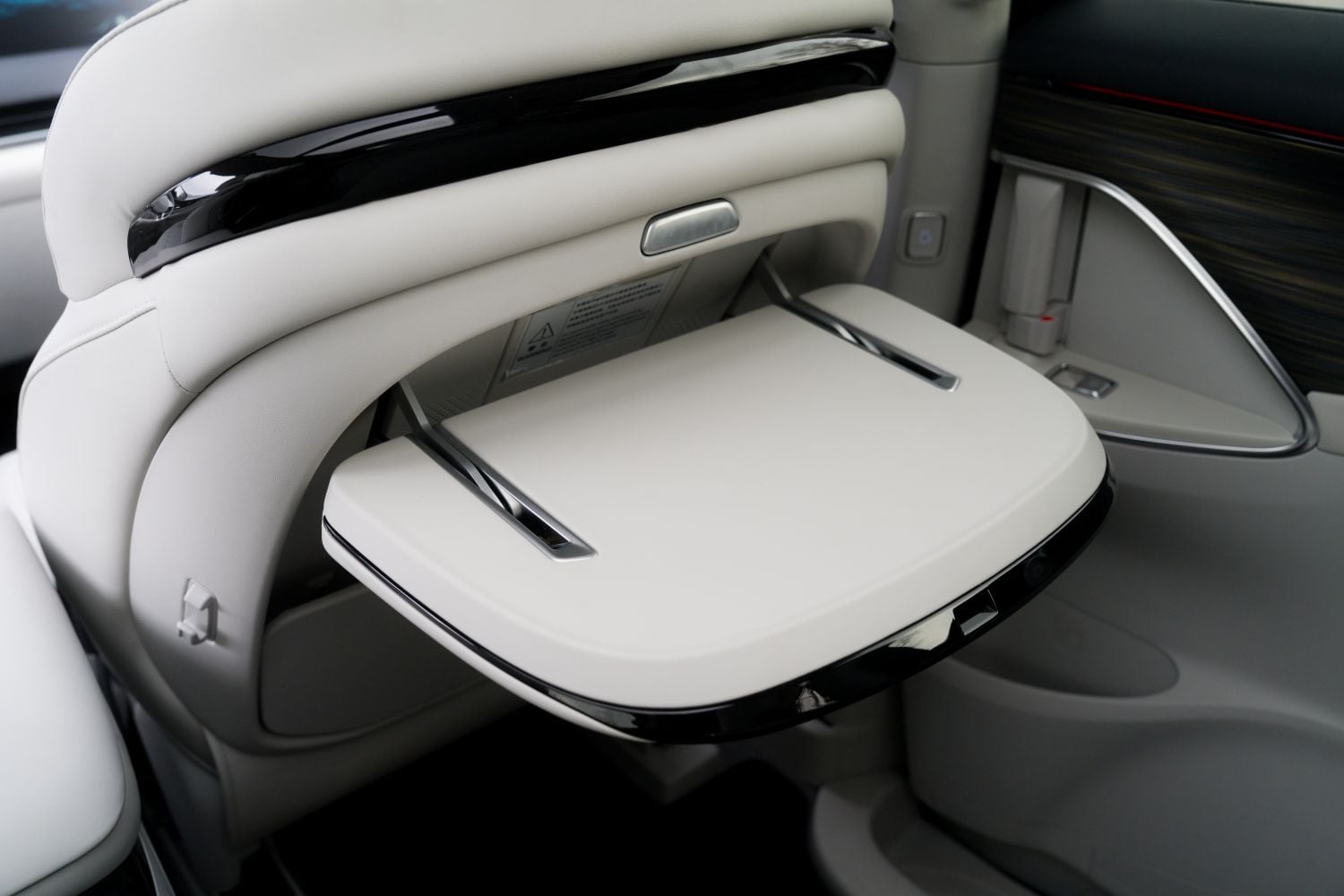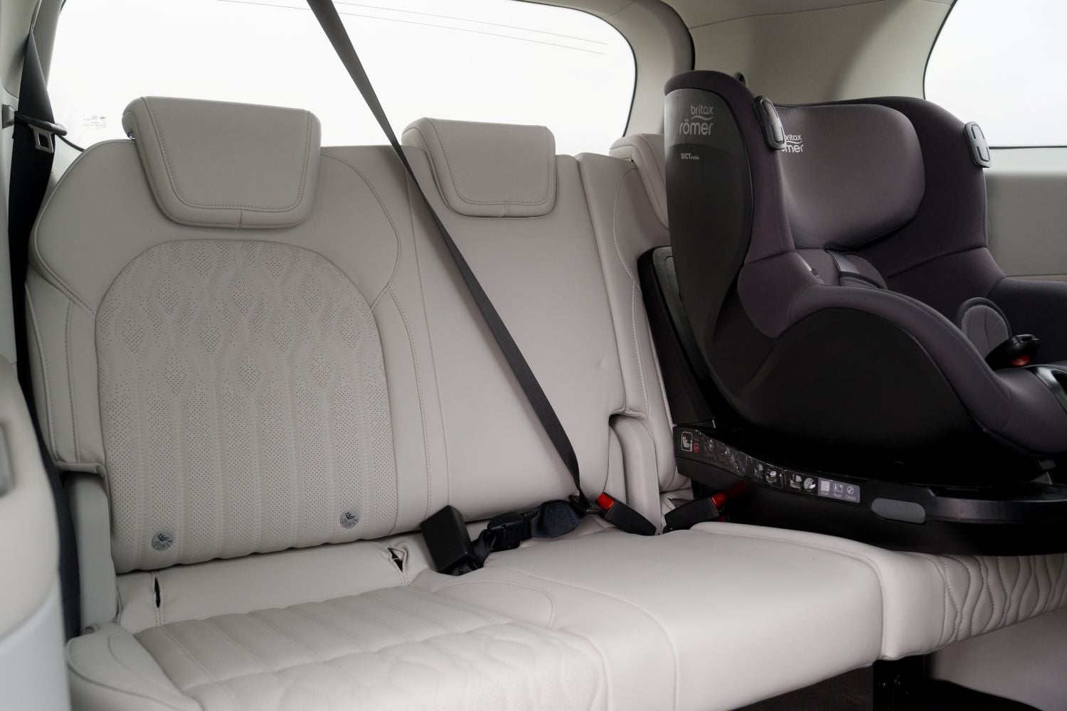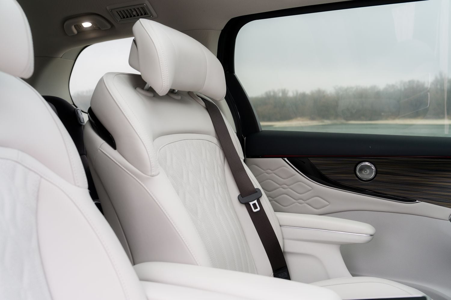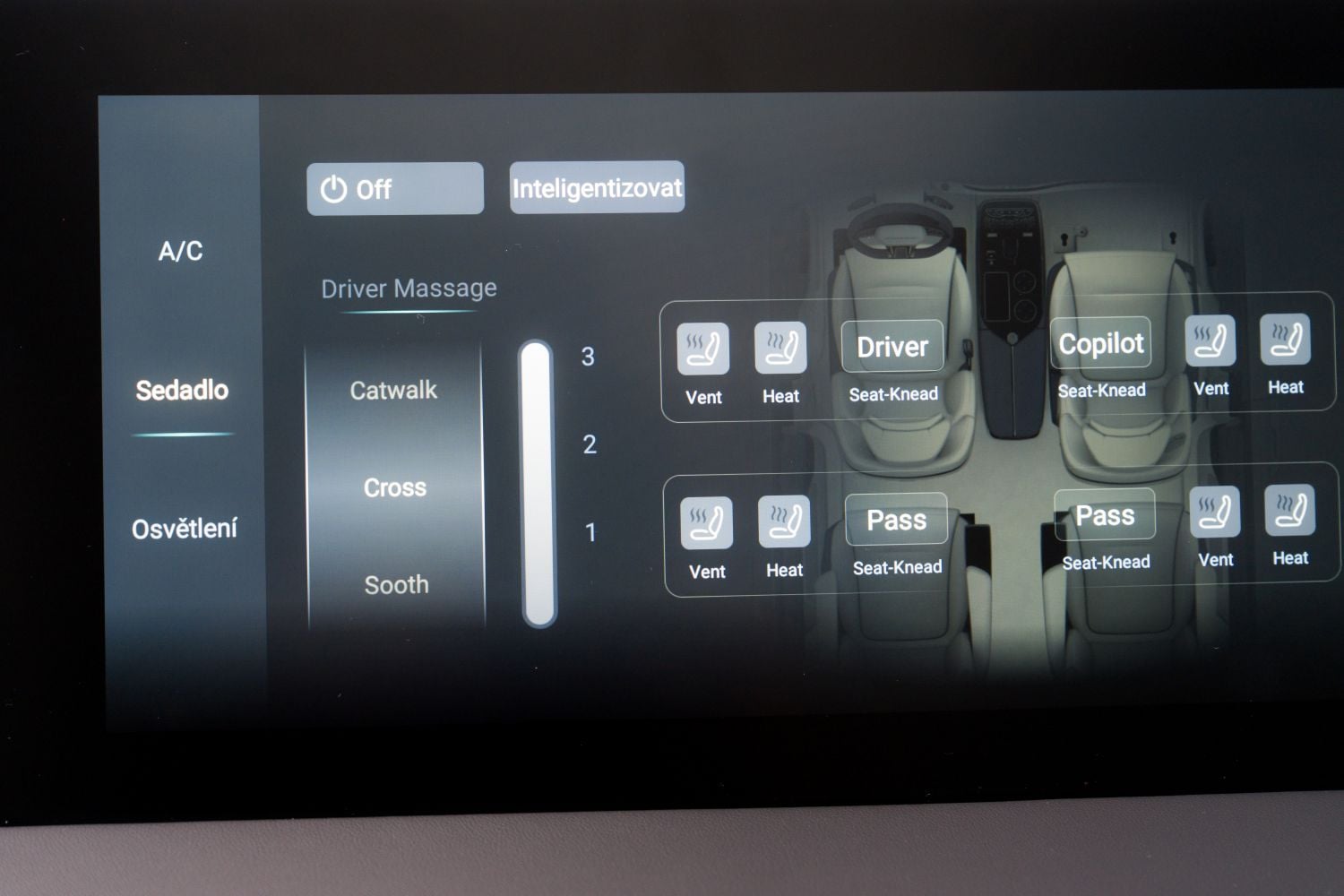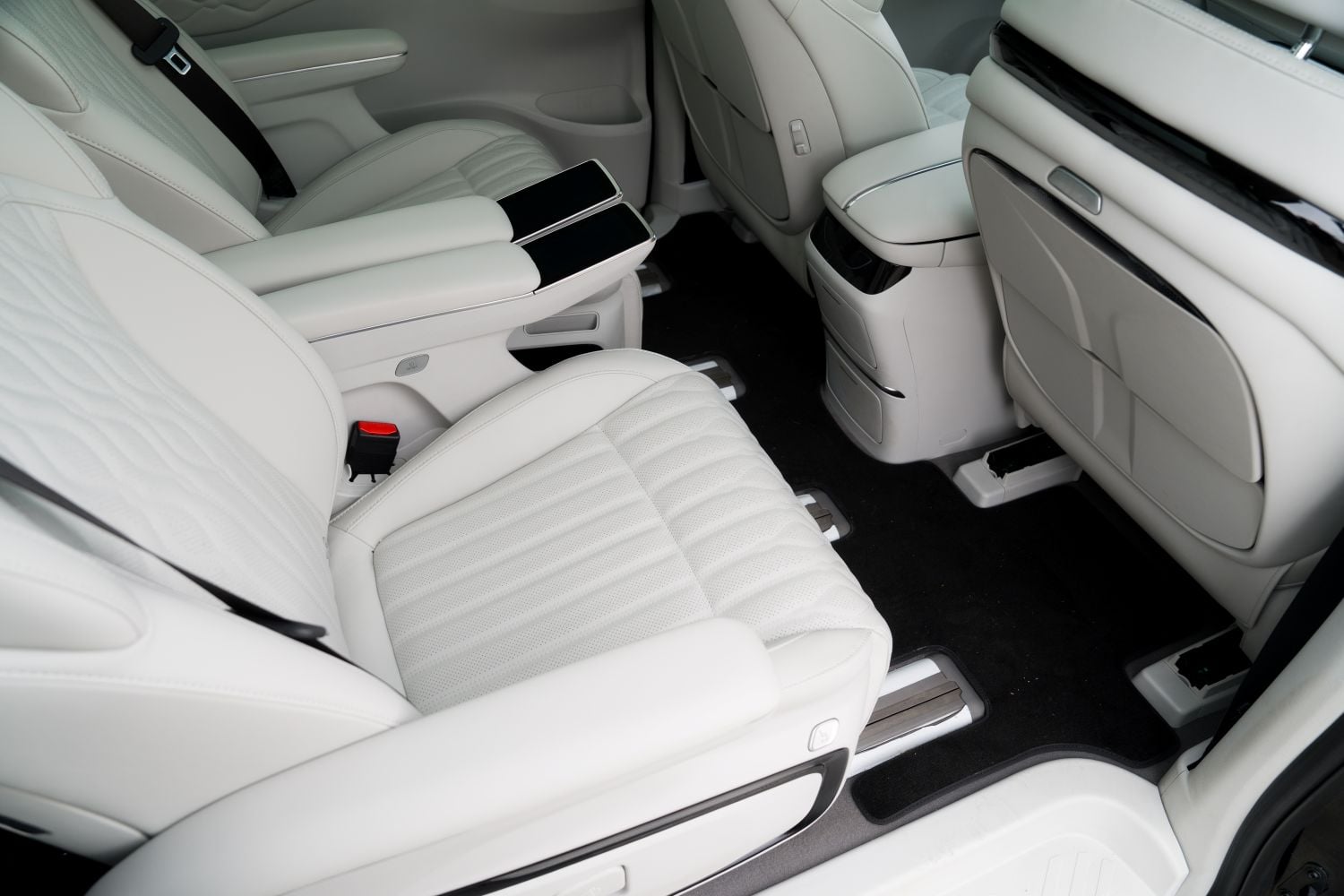 Druhý rad sedadiel je doslova highlightom celého auta, pretože ponúka tzv. kapitánske kreslá, ktoré svojou výbavou a komfortom pripomínajú biznis triedu v lietadle. Sedadlá sú elektricky nastaviteľné, ponúkajú vyhrievanie, ventiláciu aj masážnu funkciu a nechýba im ani možnosť aktivovať takzvaný prezidentský režim, pri ktorom sa vysunie opora na lýtka a cestujúci sa môže takmer celý natiahnuť. Pocit z cestovania na zadných sedadlách je v tomto prípade naozaj výnimočný a ide o jeden z najväčších tromfov celého auta.