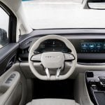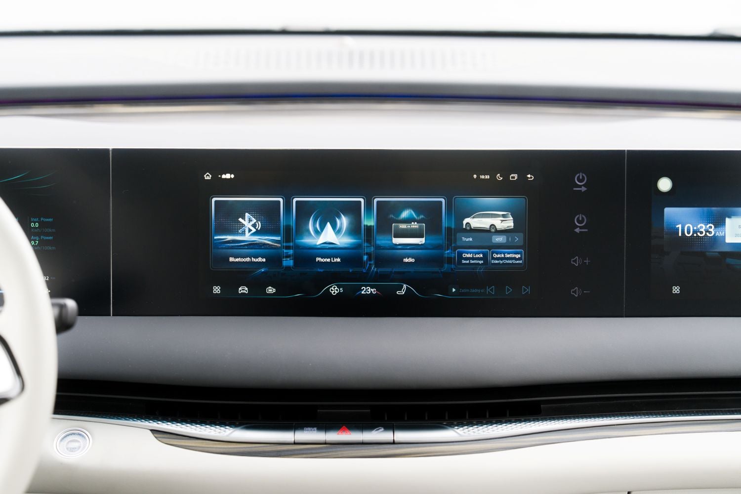 Predná časť interiéru pôsobí moderne a vzdušne, pričom jej dominujú tri displeje, ktoré sú zasadené do jedného celku a vytvárajú technologicky ladený dojem. Použité materiály sú vo väčšine prípadov kvalitné a mäkčené, hoci na niektorých miestach sa objavujú aj tvrdšie plasty, ktoré pripomínajú, že nejde o prémiové vozidlo. Pozitívom je matný povrch displejov, ktorý eliminuje odlesky a zlepšuje čitateľnosť. Stredová konzola je prakticky riešená a ponúka dostatok úložného priestoru, vrátane hlbokej lakťovej opierky či veľkého odkladacieho priestoru pod ňou.