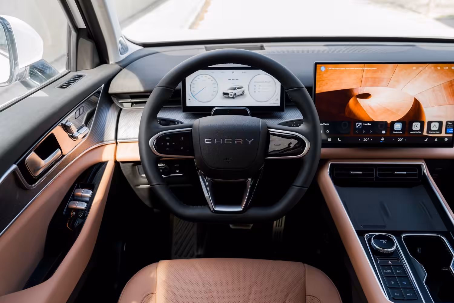 Ak by ste si sadli do Chery Tiggo 9 bez znalosti jeho pôvodu, pravdepodobne by ste tipovali vyššiu strednú triedu. Použité materiály sú kvalitné, mäkčené plasty a syntetická koža pôsobia odolne a príjemne na dotyk. Interiér kombinuje moderné prvky s relatívne konzervatívnym usporiadaním. Dominantou je veľký dotykový displej, cez ktorý sa ovláda väčšina funkcií vrátane klimatizácie. Nechýba head-up displej ani digitálny prístrojový štít či bezdrôtová nabíjačka s výkonom 50 W. Praktickosť dopĺňajú početné úložné priestory vrátane chladeného priestoru pod lakťovou opierkou. Komfort posádky zvyšujú vyhrievané a ventilované sedadlá (aj v druhom rade) či slnečné roletky. Dokonca aj spolujazdec si môže dopriať relaxačnú polohu s vysúvateľnou opierkou na nohy a masážnou funkciou.