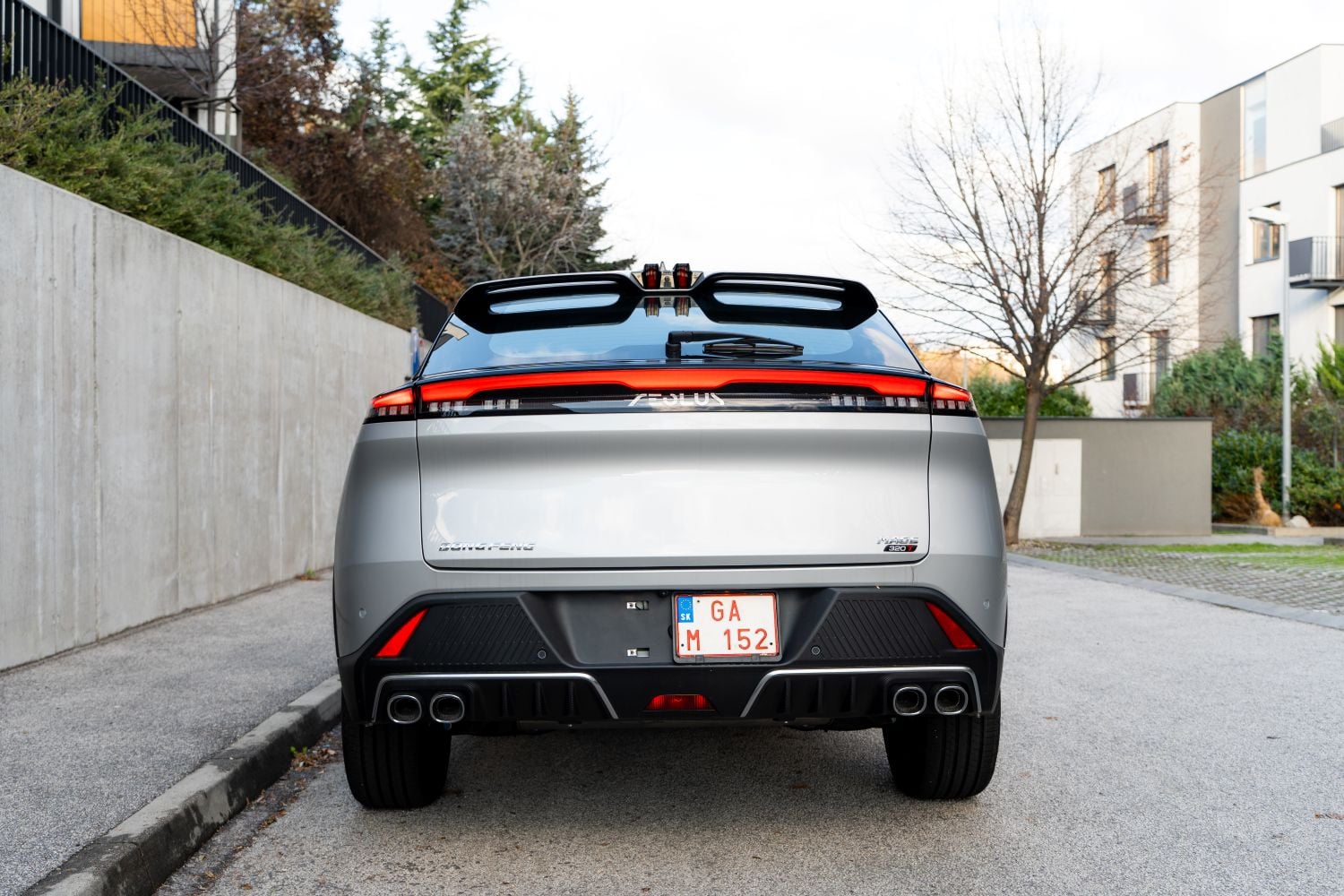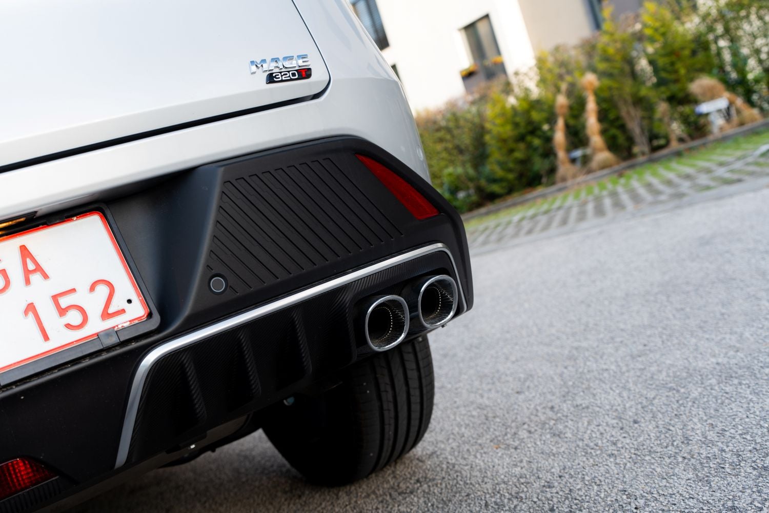 Testovaný kus obúval 19-palcové disky kolies s pneumatikami s rozmermi 235/55 R19 od absolútne neznámej značky. Vzhľadom na relatívne vysoký výkon a vlastnosti, ktoré tieto pneu vykazovali na ceste, odporúčame siahnuť po pneumatikách od tradičnejších značiek. Zadná časť pokračuje v sebavedomom dizajne, o ktorý sa stará výrazný LED svetelný podpis a strešné krídlo. Jediným rušivým prvkom sú štyri falošné koncovky výfuku, ktoré sa k charakteru auta príliš nehodia a pôsobia skôr samoúčelne.