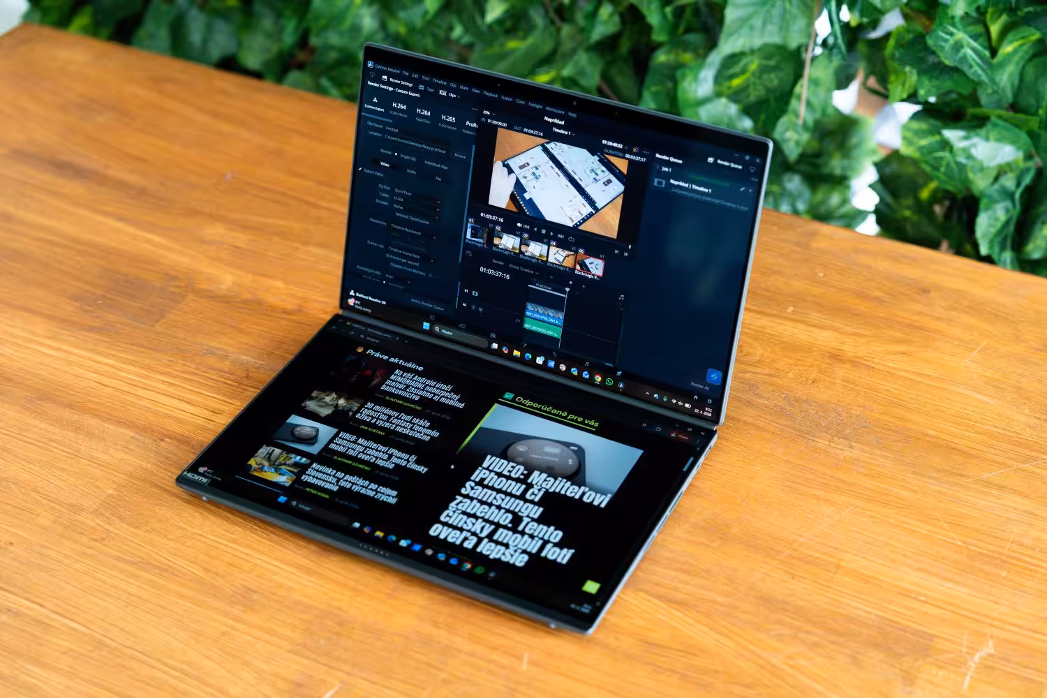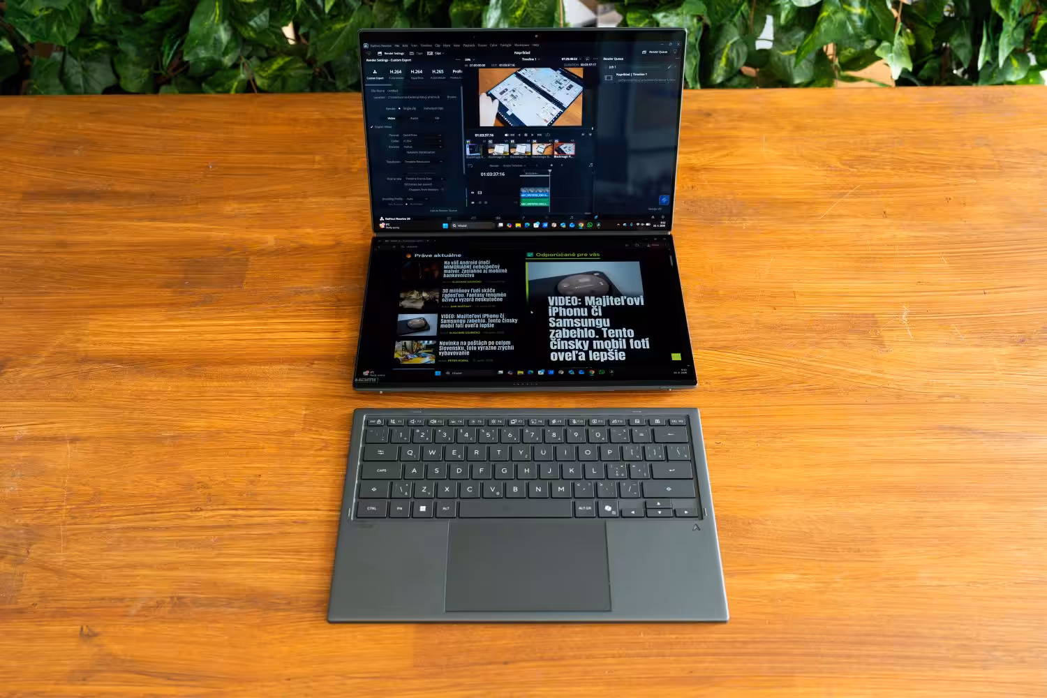 Mimoriadne jemné 3K rozlíšenie a obnovovacia frekvencia až k 144 Hz na oboch displejoch znamená, že s notebookom je radosť pracovať. Profesionálne využitie spríjemňuje aj HDMI port, dvojica USB-C portov a jedno klasické USB-A. Chýba azda len čítačka SD kariet, ktorú by určite privítali grafici či fotografi. Oba panely majú OLED technológiu, ktorá zaručuje vernejšie farby a kontrast. Výborný je aj maximálny jas a čitateľnosť na slnku.