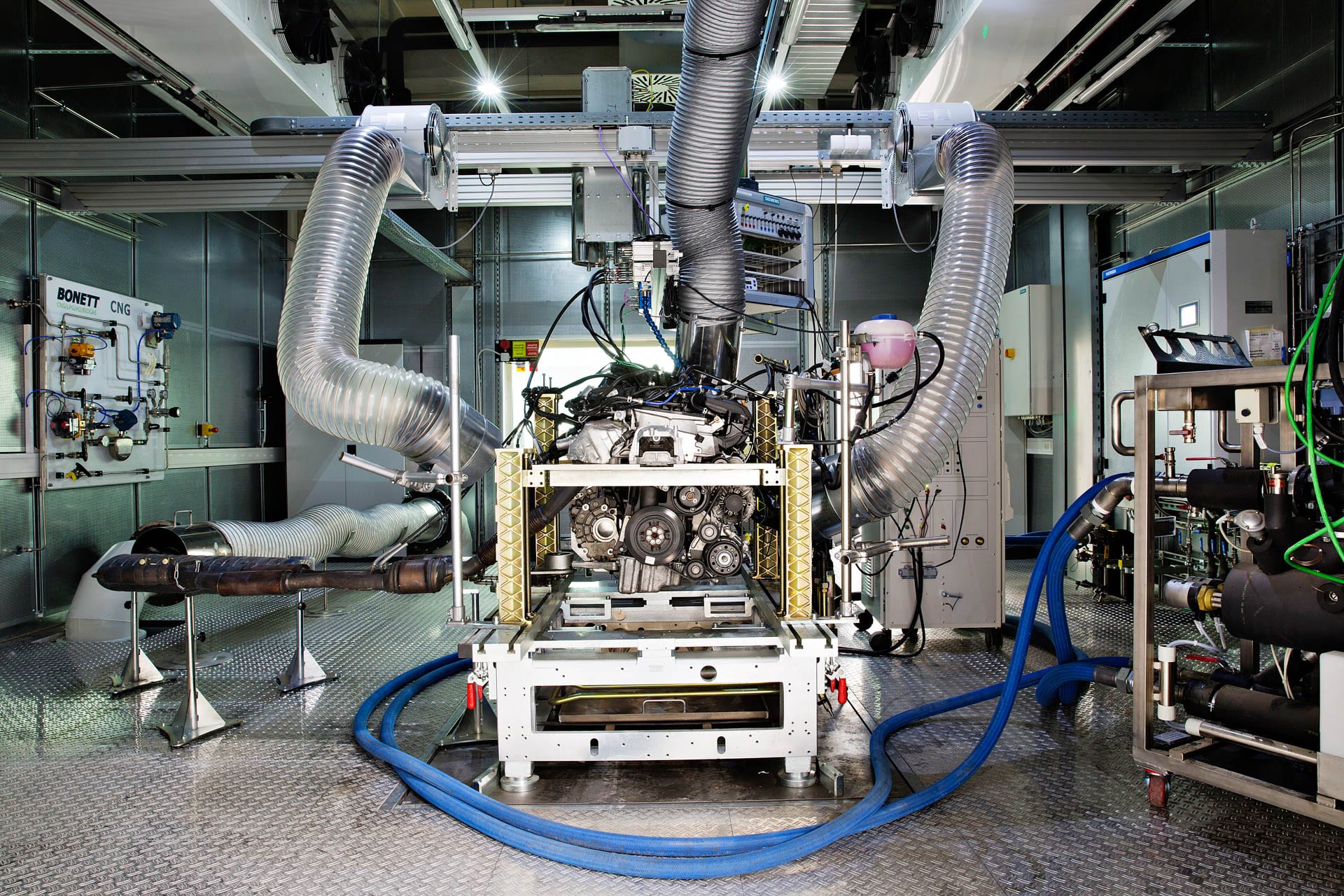 Vzduchotechnika odvádza spaliny od výfuku okamžite preč. Medzi jednotlivými stanicami sú umiestnené analyzátory pre meranie zloženie emisií testovaných motorov. Tá dokaže prečerpať až 136-tisíc metrov kubických vzduchu za hodinu.