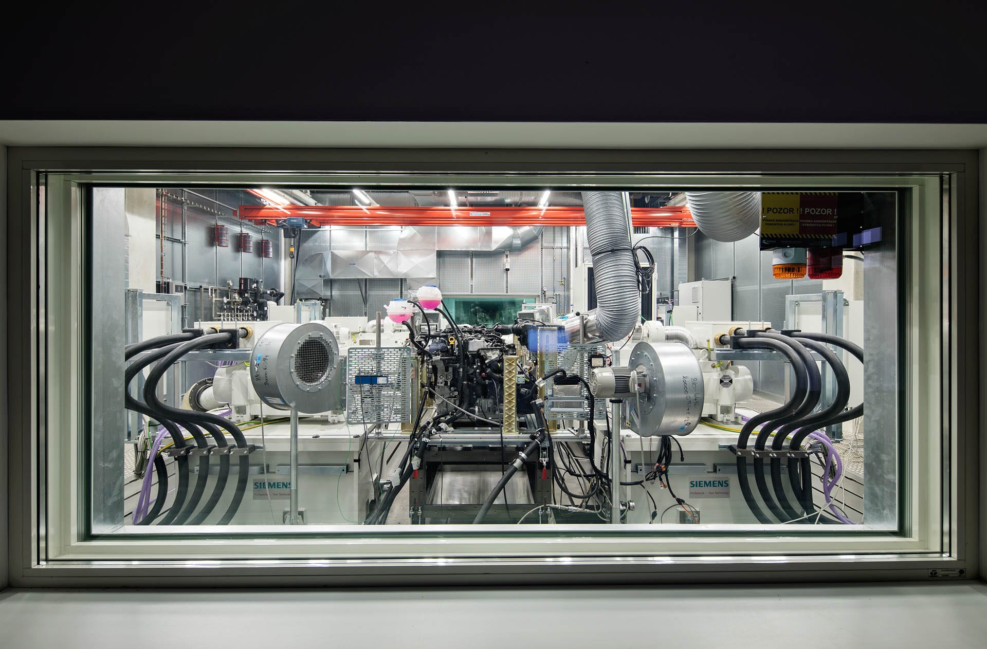 Každý skúšobný priestor je z akustických a bezpečnostných dôvodov oddelený od obsluhy lepeným “nepriestrelným” sklom. Motory sa počas testovania nachádzajú na vzduchom odpružených zliatinových doskách, ktoré vážia až 40 ton. Dôvodom je zabránenie prenosu vibrácií pri testovaní na celú budovu Motorového centra, vysvetľuje Hrdlička.