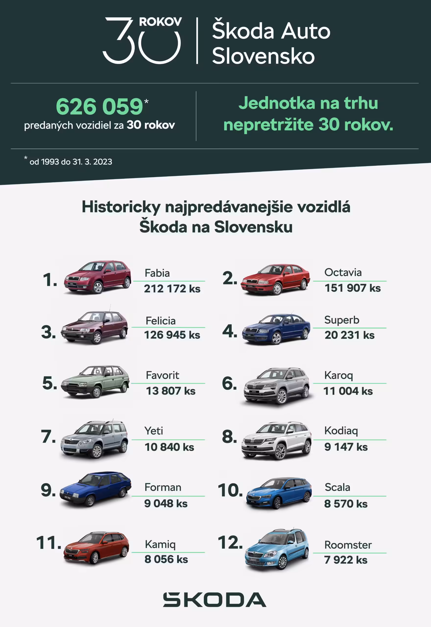 Aj napriek tomu, že Škoda je českou automobilkou, je stále vnímaná ako domáca, čo prezentuje aj svojim dominantným trhovým podielom. Za uplynulých 30 rokov dodala Škoda na Slovensku neuveriteľných 626 029 automobilov. Môžeme tak prehlásiť, že takmer každý šiesty Slovák vlastnil alebo vlastní Škodovku. Vydajte sa spolu s nami na cestu novodobej histórie našej krajiny a automobilky Škoda.