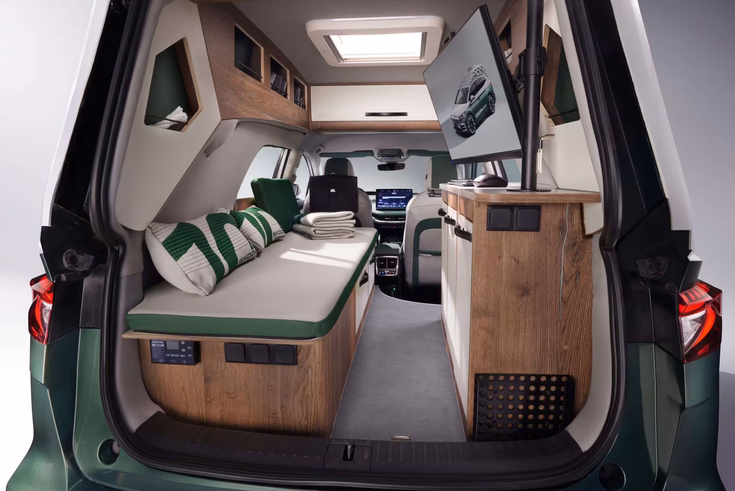 Okrem kempingového a kancelárskeho vybavenia v zadnej časti vozidla študenti vytvorili aj pracovné miesto na mieste spolujazdca. Špeciálne rameno ponúka spolujazdcovi miesto na upevnenie tabletu. Interiér dopĺňa množstvo prvkov vybavenia a príslušenstva pre zábavu a oddych, z ktorých niektoré sú už teraz súčasťou ponuky vozidiel značky Škoda. Patrí medzi ne bezdrôtový reproduktor, solárna sprcha, kávovar na espresso s prípojkou na 12 V, kuchynské spotrebiče, stoličky, stoly, taniere, hrnce a panvice, šálky a poháre, USB a nabíjacie káble, koberce a lišty, a tiež svietidlá a sada na prežitie.